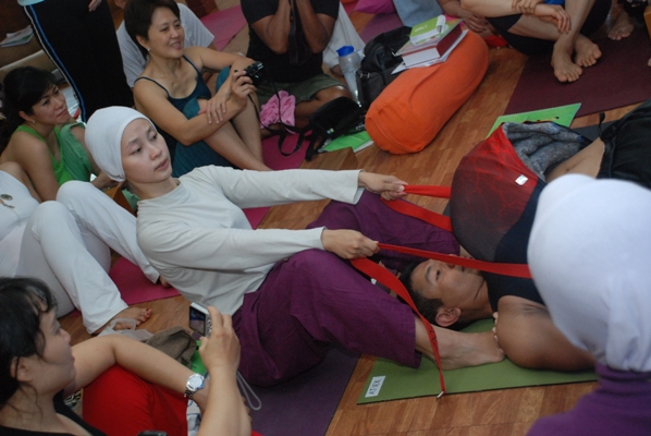 Hal yang paling menarik dari pelatihan ini adalah hadirnya beberapa orang peserta pria yang tertarik untuk mempelajari praktik – praktik prenatal yoga. Dengan penuh perhatian para peserta pria berpartisipasi penuh dalam setiap bagian dari pelatihan ini, termasuk saat diminta mengganjal perut dengan bantal agar dapat berempati pada keterbatasan fisik ibu hamil. Keterbukaan sikap ini sangat patut dihargai, mengingat kehamilan dan kelahiran sebenarnya bukan hanya isu bagi perempuan, melainkan isu bagi seluruh keluarga. Memberikan pemahaman yang menyeluruh tentang proses kehamilan & kelahiran pada pria akan memberdayakan mereka untuk lebih mensupport usaha kesehatan dan kesejahteraan perempuan selama kehamilan. Dengan mempelajari teknik prenatal yoga, para peserta pria – yang semuanya merupakan pengajar yoga ini – dapat memberikan latihan yang lebih sesuai dengan kebutuhan murid hamil di dalam kelasnya sekaligus juga memberdayakan para suami untuk lebih mensupport istrinya selama kehamilan, saat melahirkan, dan pasca kelahiran.